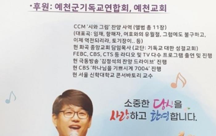 [채석일 기자] 예천군 기독연합 찬양단 ‘라소이워십(대표 김준헌 목사.신풍교회)이 21일(토) 오후5시 예천교회(김영수 목사 시무)에서 찬양사역자 시와그림 김정석 목사 초청 찬양간증집회를 개최했다.’주님과 함께하는 시와그림의 찬양여행‘이라는 타이틀로 열린 이날 찬양집회