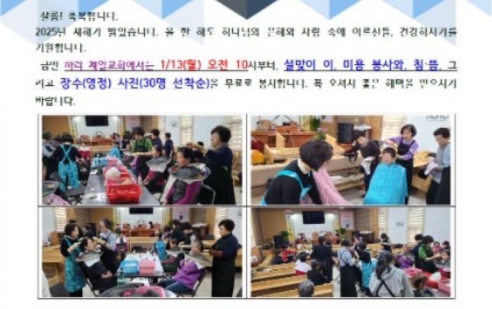 [채석일 기자]하리제일교회(김명규 목사)는 오는 1월 13일 오전10시부터 교회 본당에서 지역민들을 위해 매년 실시해오고있는 '사랑의 이.미용 봉사'를 실시한다고 밝혔다.하리제일교회가 주최하고 드보라 이.미용 봉사팀(대구)과 은효(은풍.효자)적십자 회원들이 함께 하는