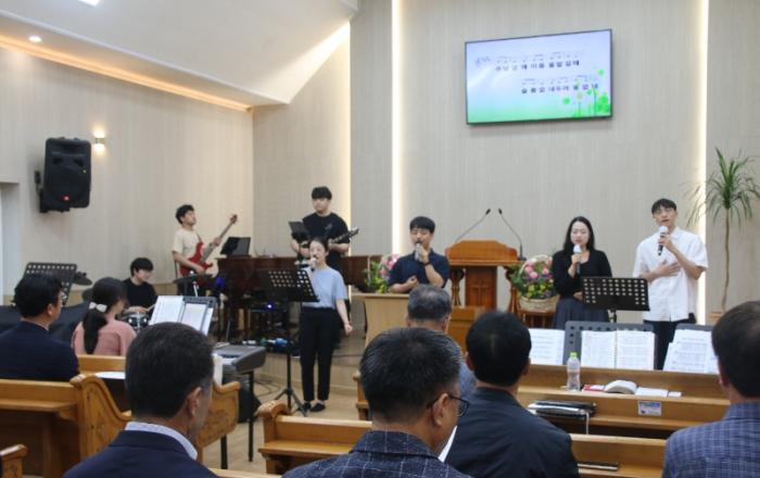 [채석일 기자]예천군기독신우회(회장 황칠환 장로.예천교회)는 10일 저녁7시 예천백합교회(김경환 목사)에서 6월 정기예배를 가졌다.이날 정기 예배는 지난 5월 예천백합교회가 예배당을 새롭게 단장을 하고 라소이찬양단(지도목사 김경환)을 초청, 기독신우회 2025년 상반기