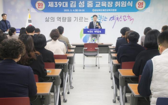 예천교육지원청은 3월 4일(화) 4층 대회의실에서 지원청 및 예천도서관 전 직원이 참석하여 제39대 김성중 교육장의 취임식을 가졌다. 김성중 교육장은 대구교육대학교 초등교육과를 졸업하고(동 대학원 초등컴퓨터교육학 석사), 1990년 포항 죽북초등학교에서 교직을 시