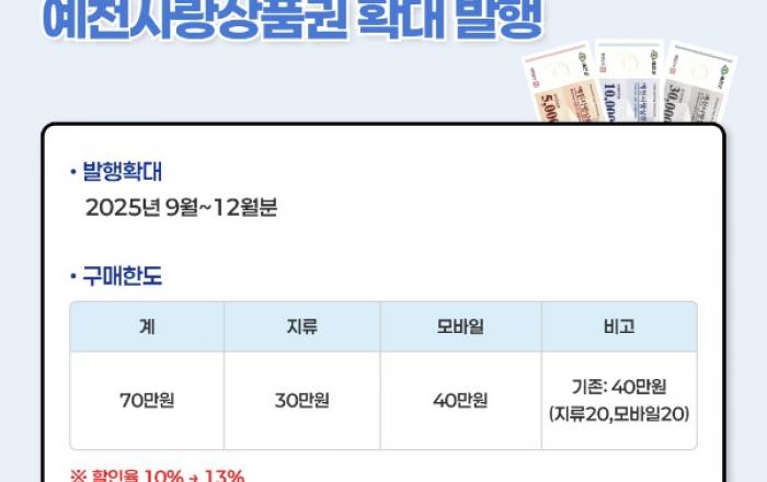 예천군(군수 김학동)은 침체된 소비심리를 회복하고 골목상권과 전통시장의 활력을 높이기 위해 올해 총 434억 원 규모의 ‘예천사랑상품권’을 발행한다고 26일 밝혔다. 당초 연간발행 계획은 200억 원 수준이었으나, 군민들의 높은 구매 수요와 지역경제 파급효과를 고려해