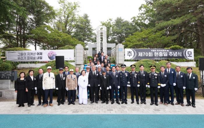 예천군(군수 김학동)은 6일, 예천읍 남산공원 충혼탑에서 제70회 현충일을 맞아 나라를 위해 목숨을 바친 순국선열과 호국영령의 숭고한 희생을 기리기 위한 현충일 추념식을 엄숙히 거행했다. 이날 추념식에는 김학동 군수를 비롯해 강영구 군의장과 군의원, 도기욱‧