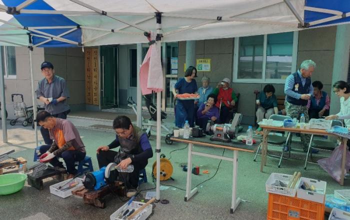 [채석일 기자]지난 8일 오후2시 가은은혜봉사단(단장 김광진 목사.은혜교회)은 30도를 넘어가는 더위의 날씨에도 작천1리 마을회관에서 기다리는 어르신들을 생각하며 달려갔다.매월1회 가은지역 전역을 순회하며 칼갈이 봉사를 실천하고있는 가은은혜봉사단은 이날도 어김없이 “동