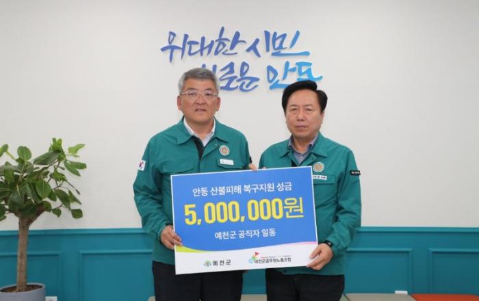 예천군(군수 김학동) 공직자 일동은 18일 오전 10시, 안동시청을 방문해 대형산불로 인한 피해복구 성금 5백만 원을 안동시에 전달했다. 이번 성금은 대형산불로 인하여 피해를 입은 안동시 주민들을 지원하고자 예천군 공직자들이 자발적으로 모금하여 마련했으며,