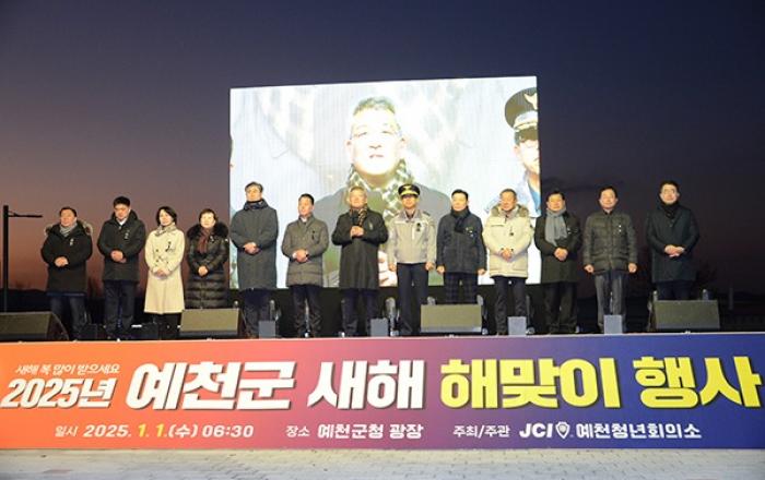 군민 안녕과 행복을 기원하는 2025년 을사년 해맞이 행사가 1일 오전 7시 군청 광장에서 열렸다.예천청년회의소(회장 남지석)가 주최·주관했으며, 제주항공 여객기 참사로 식전행사 및 새해 박 터트리기 행사는 취소된 가운데 조용히 진행됐다.이 자리에는 김학동 군수, 강영