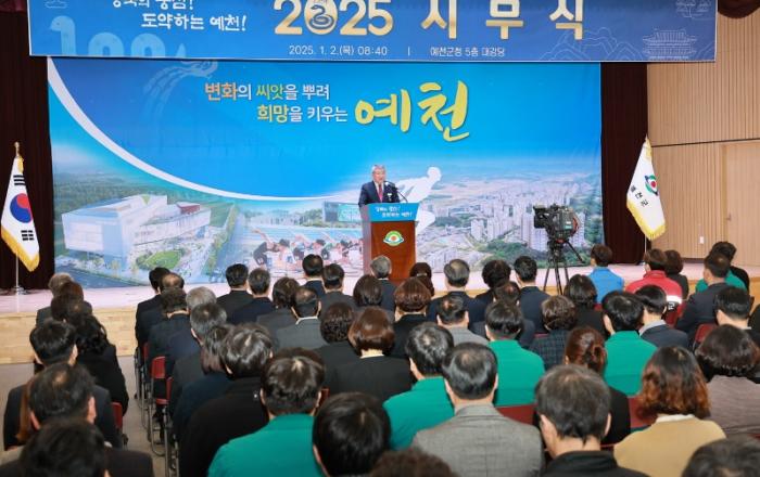 예천군(군수 김학동)은 2일 오전, 군청 대강당에서 ‘2025년 시무식’을 갖고 새해 업무를 시작했다. 김학동 군수는 신년사를 통해 지난 2024년은 코로나 위기의 후유증과 호우로 인한 수해 피해를 극복하기 위해 군민 모두가 하나로 뭉쳤으며 어려운 여건 속에