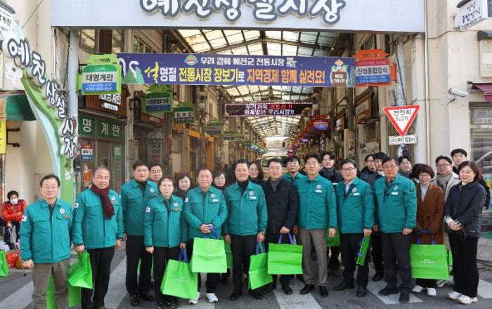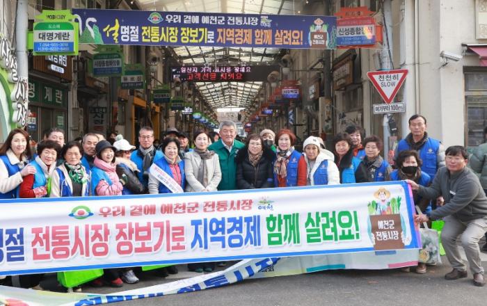 예천군(군수 김학동)은 설 명절을 맞아 지역 전통시장 상권과 서민경제를 살리고 상인들을 격려하기 위해 22일, 예천읍상설시장과 중앙시장에서 장보기 행사를 진행했다. 이날 행사에는 김학동 군수를 비롯해 예천군 새마을회, 한국자유총연맹 예천군지회, 바르게살기운동