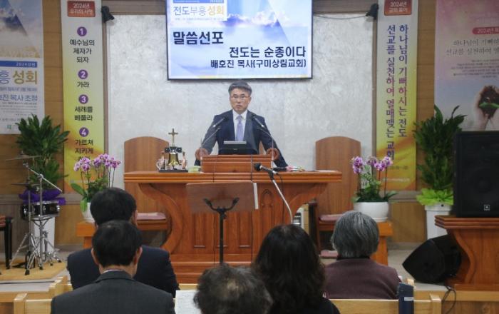 [채석일 기자]하리제일교회(담임목사 김명규)는 14일 저녁7시 교회 본당에서 구미상림교회 배호진 목사를 강사로 2024년 전도부흥성회를 시작했다. 이날 저녁을 시작으로 사흘동안 열리는 부흥성회 첫날, 배호진 목사는 '전도는 순종이다'(요나서 3:1-5)라는 제목으