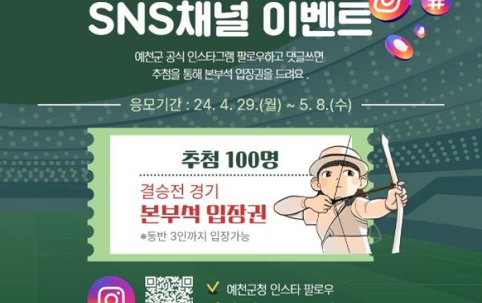 예천군은 「예천 2024 현대양궁월드컵대회」 개최기념 이벤트를 4월 29일부터 5월 8일까지 진행한다.이벤트 참여는 누구나 가능하며, 예천군 공식 인스타그램을 팔로우하고 현대양궁월드컵 게시물에 응원 댓글을 남긴 다음 화면을 캡처해 이벤트폼에 등록하면 된다.참