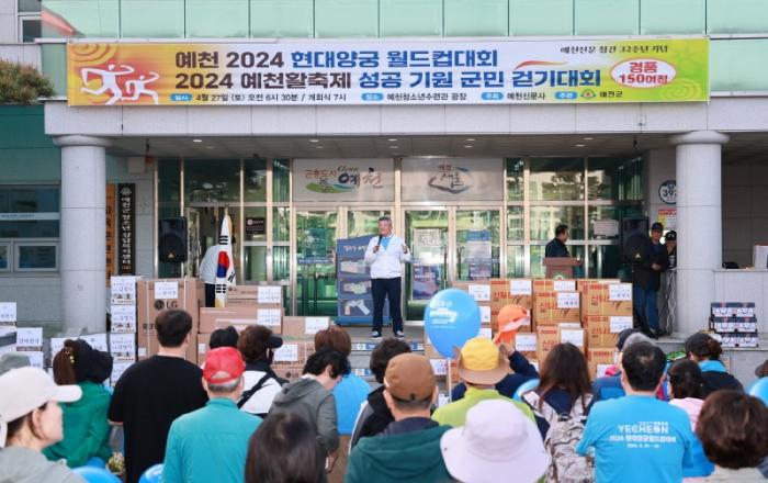 2024 예천활축제 및 양궁월드컵대회 성공 개최를 기원하는 군민 건강 걷기대회'가 27일 오전 7시 예천청소년수련관 광장에서 간단한 기념식과 출발전 준비운동을 마치고 김학동 군수의 징소리와 함께 출발하여 청소년수련관~농업기술센터~구.예천교~동본이원아파트~청소년수련관으로