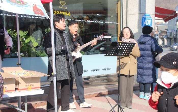 [Photo by 채석일]27일 예천중앙교회(강전우 목사) 여전도회는 예천장날인 27일 천보당사거리에서 중앙교회 찬양단과 함께 거리 전도를 실시했다.한파가 기승하는 추운 날씨에도 강전우 목사를 비롯한 여전도회원들은 남종덕 장로와 찬양단의 거리 찬양