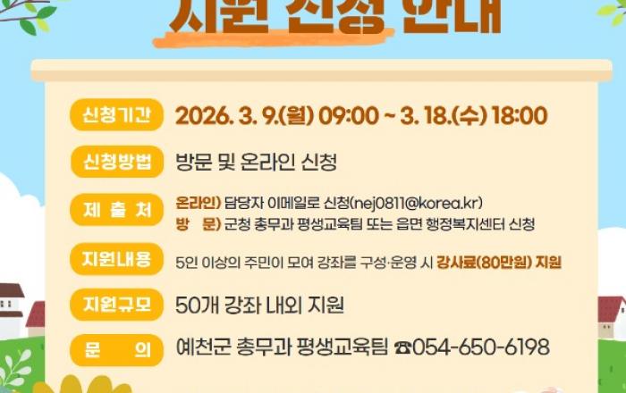 예천군(군수 김학동)은 3월 9일부터 3월 18일까지 2026년 ‘찾아가는 마을평생교육강좌’ 참여 희망자를 모집한다. ‘찾아가는 마을평생교육강좌’는 5명 이상의 군민이 학습모임을 구성해 희망 강좌를 신청하면, 예천군이 강사료를 지원해 마을과 생활권 가까이에서
