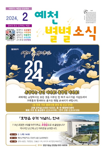 ‘예천별별소식’ 2월호에는 ‘야생동물 피해 예방시설 설치 지원사업, 농업인 지원 보험 가입 안내, 아동발달지원계좌 가입 안내’ 등 각종 지원사업과 ‘갑진년 정월대보름 달집태우기 행사, 군민디지털 역량 강화 교육’ 등 군에서 진행하는 교육과 행사들에 관한 정보가 상세하게 실렸다.