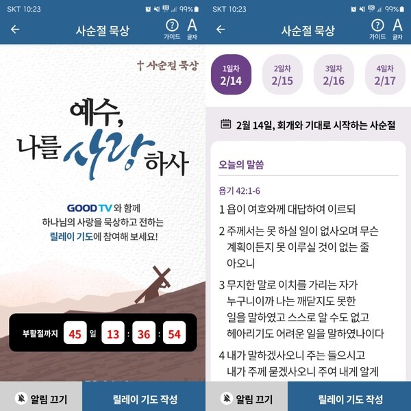 또 앱에 있는 릴레이 기도에 참여하면 매일 자신과 이웃을 위한 기도제목도 나눌 수 있다. 성도들의 기도 제목은 GOODTV 대표 생방송 프로그램인 '기적을 이루는 기도, 달리다굼'에도 함께 공유된다.