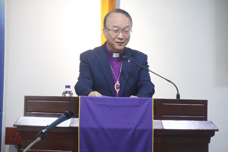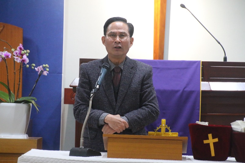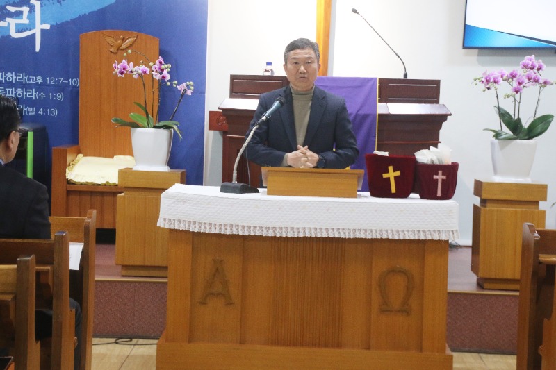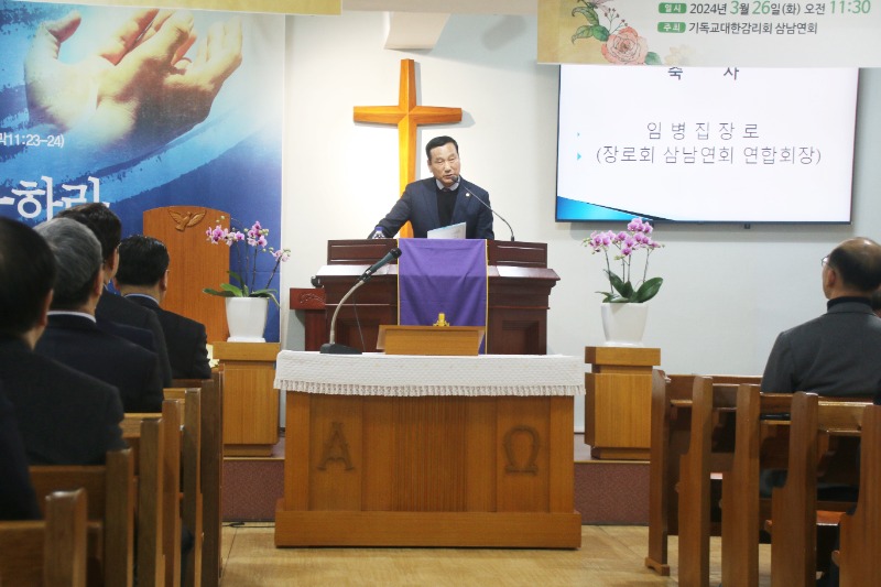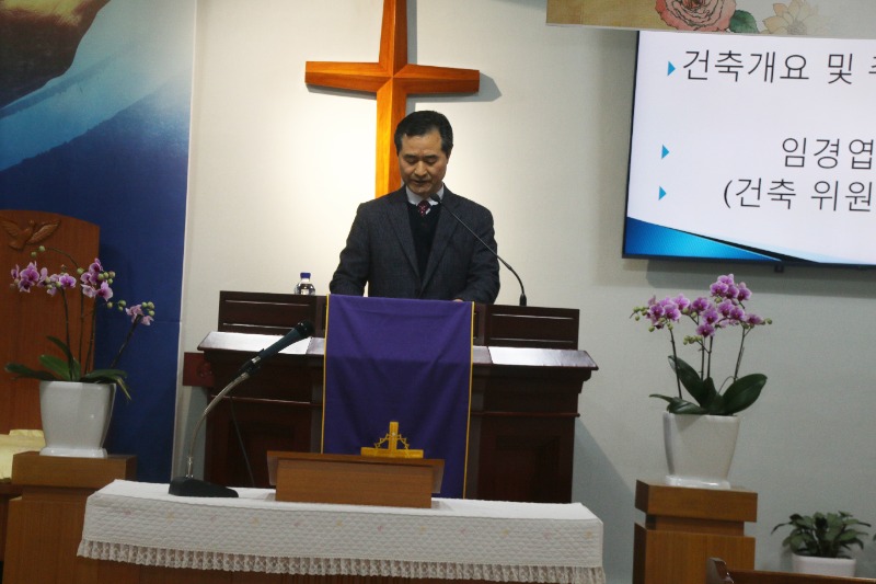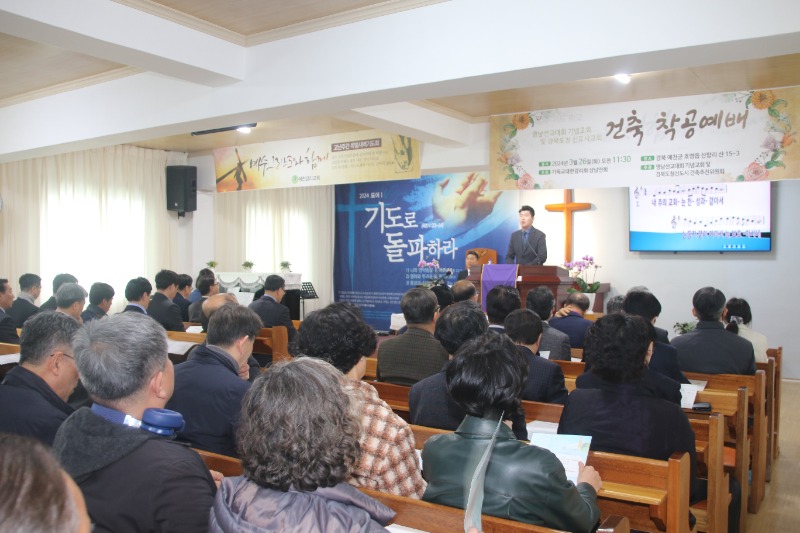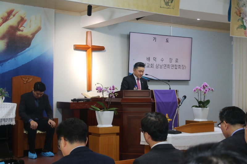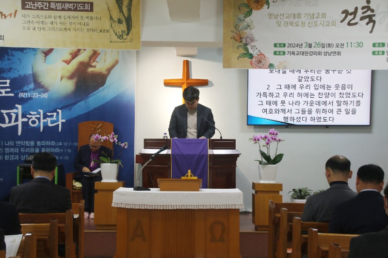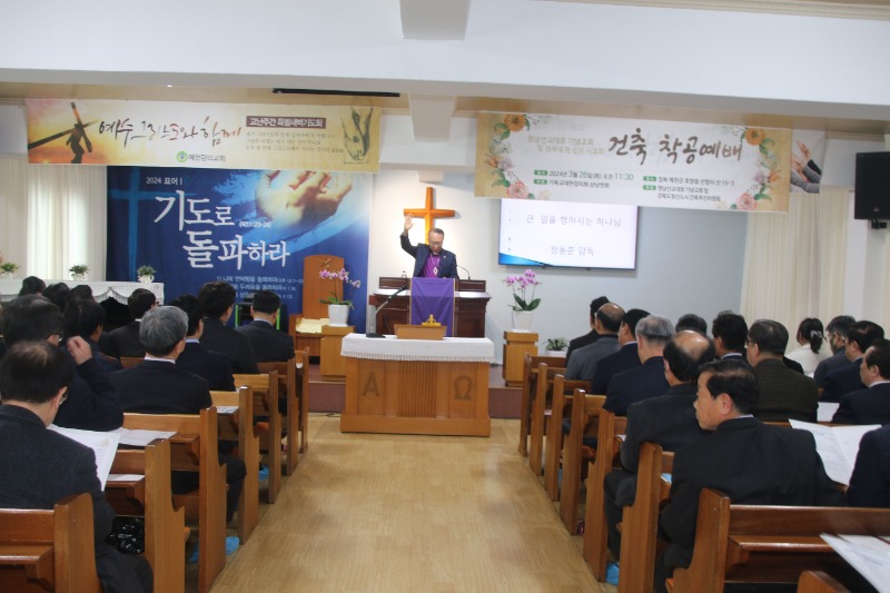 김해민 목사(부산 정관온누리교회)의 집례로 진행된 예배는 남선교회 삼남연회장 배덕수 장로(제주 조천교회)의 기도,청장년선교회장 이은효 집사(창원 큰나무교회)의 성경봉독,정동준 감독(부산동래온천교회)의 말씀선포에이어 건축추진위원장 임경엽 장로(부산 성일교회)의 건축추진개요,경과보고,내빈축사 및 시공사대표인사,축도(황병원 전감독) 순으로 진행됐다.
