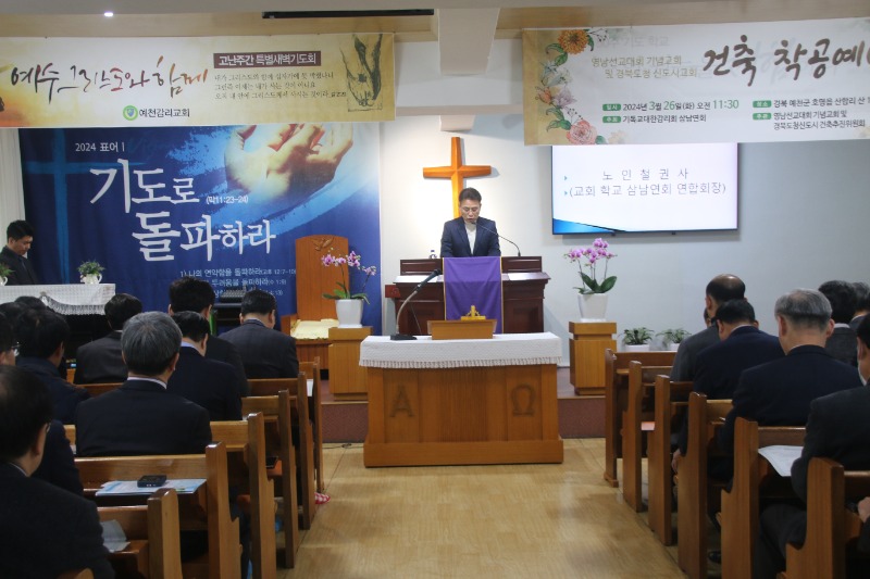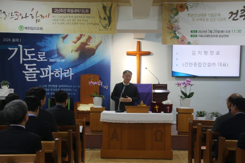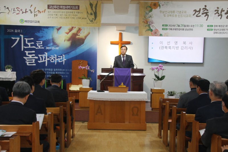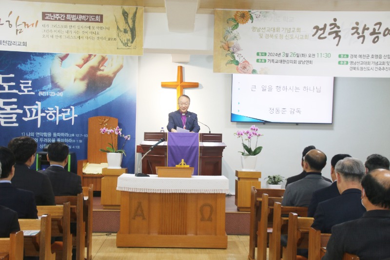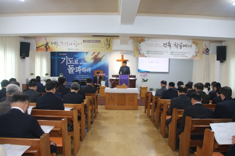 삼남연회(회장 배덕수 장로.제주 조천교회)가 주최하고 건축추진위원회(회장 임경엽 장로.부산 성일교회)가 주관, 사업 추진 4년 만에 열리는 착공 감사예배는 이날 경북도청신도시 교회건축 부지인 호명면 산합리에서 드릴 예정이었으나 우천관계로 인해 예천감리교회 본당에서 드렸다.