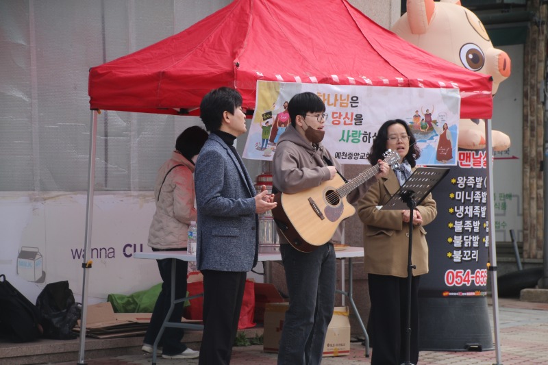 한편 이날 천보당 사거리에는 예천중앙교회(강전우 목사) 선교팀들이 예수님 찬양을 부르며 전도버스킹을 하고있어 부활의 기쁨과 계란나눔의 의미와 감사의 마음을 더했다.