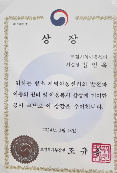 로뎀지역아동센터 시설장인 김 장로는 아동복지시설에 종사하며 취약계층 아동 보호·교육·건전한 놀이제공, 보호자와 지역사회의 연계 등 아동의 건강한 성장을 위해 힘써 왔다.