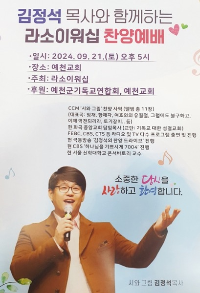 예천 라소이워쉽,김정석 목사와 함께하는 찬양예배 연다.