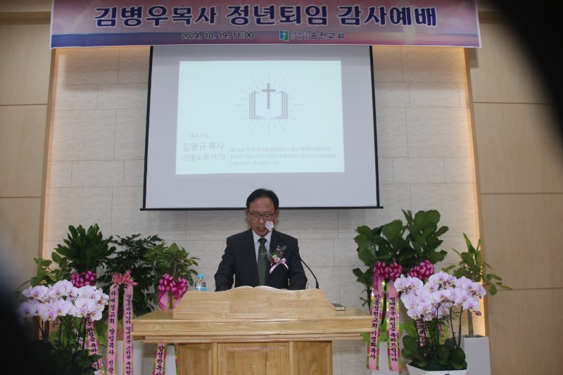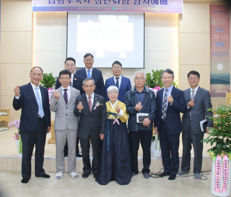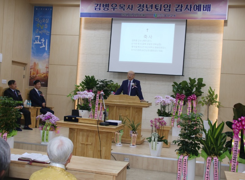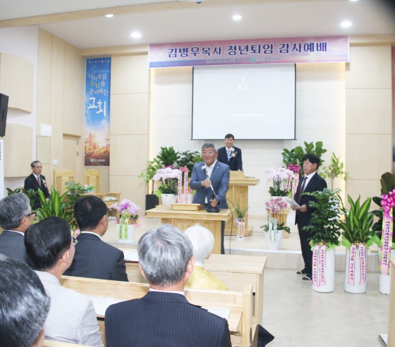 이날 퇴임예배는 예천제일교회를 담임하고있는 김운수 목사의 사회로 안동노회 서기인 김명규 목사(하리제일교회)의 기도와 이 경우 장로(송전교회)의 퇴임자 소개,김학동 예천군수,손석원 목사(경북경찰청 경목실장),전 대신대학교 총동창회장인 황재열 목사,송전교회 출향성도 대표인 임석교 장로의 축사, 퇴임하는 김병우 목사의 퇴임인사와 축하패 증정과 함께 안동노회 노회장인 곽현복 목사의 축도 순으로 진행됐다.
