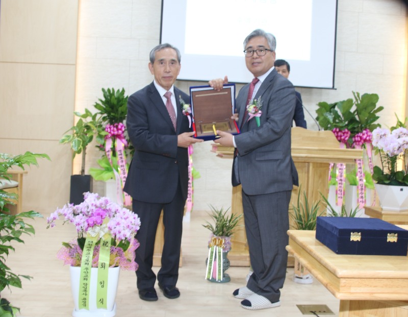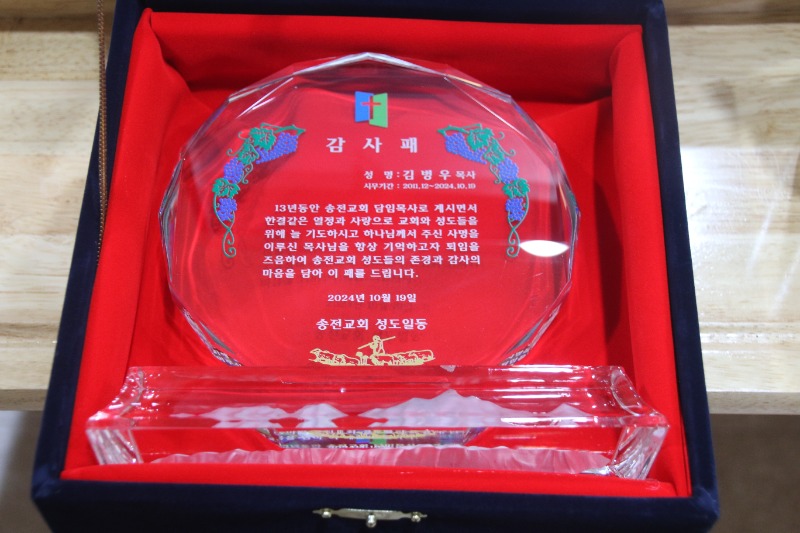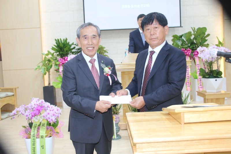 송전교회 시무장로인 정의동 장로는 축하패를 전달하며 퇴임하는 김병우 목사에게 지난 13여년을 송전교회위에 헌신함에 감사를 전했다.