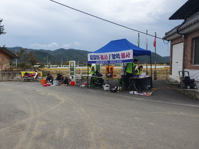 [채석일 기자]27일 오후2시 삼복더위를 멀리하고 쌀쌀해진 가을 날씨속에 예천군 용문면 제곡리 경로당앞에 칼,가위,낫 10여자루가 담긴 자루를 들고 접수대 앞에선 어르신과 분주하게 칼갈이 기계등을 설치하는 봉사단 단원들의 모습은 이제 베테랑 수준이다.