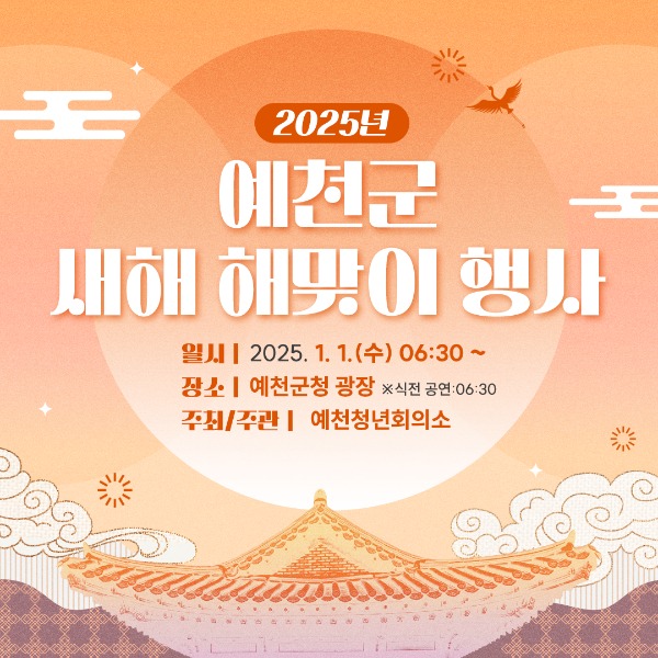 예천군(군수 김학동)은 희망찬 을사년 새해를 맞이하여 예천군의 번영과 군민의 안녕을 기원하는 새해 해맞이 행사를 1월 1일 오전 6시 30분부터 군청광장에서 예천청년회의소(회장 남지석) 주관으로 개최한다.