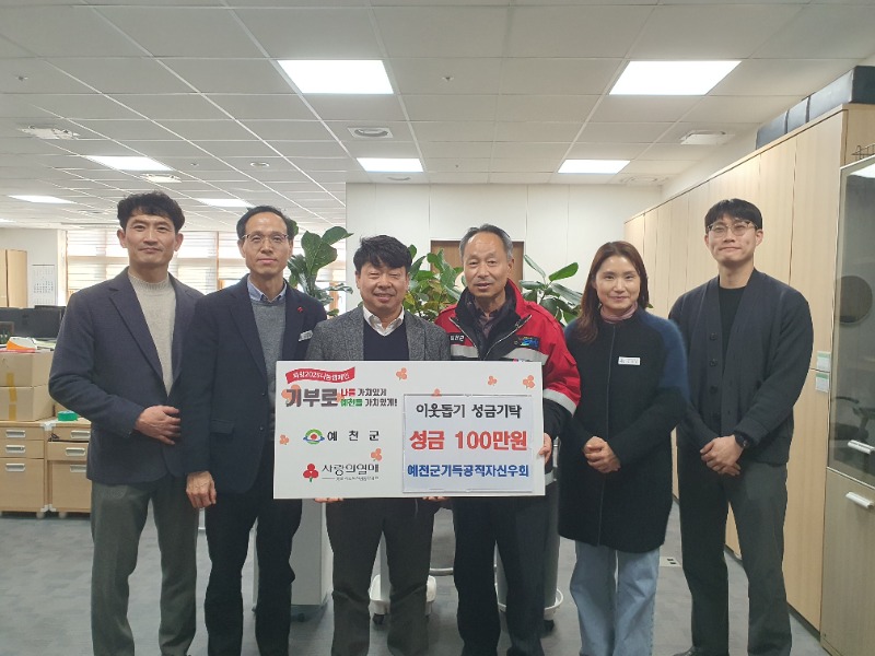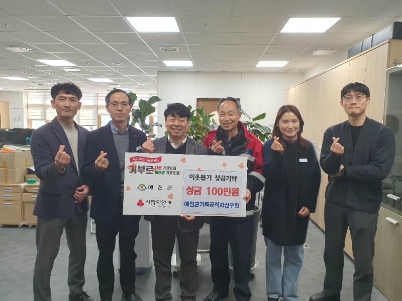 예천군기독공직자신우회(회장 장광석) 회원들은 26일 예천군청을 방문해 성금 100만원을 기탁했다. 기독교 신앙 모임인 예천군기독공직자신우회는 2019년부터 매년 연말 군청사 로비에 성탄 트리를 설치해 성탄의 기쁨을 나누어 왔으며, 42명의 회원들은 매년 성탄절을 기념하여 귤 나눔 행사를 진행해왔다.