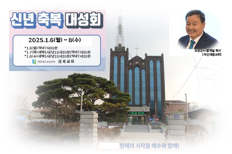 [채석일 기자]금곡교회(오성희 목사)가 2025년 신년 축복 대성회를 개최한다. 오성희 담임목사는 이번 부흥회에서 현재 부산 세광교회를 시무하고있는 황재열 목사를 초청해 오는 2025년1월6일(월) 저녁 예배(7시30분)를 깃점으로 사흘간(1월8일) 축복 대성회를 연다고 밝혔다.