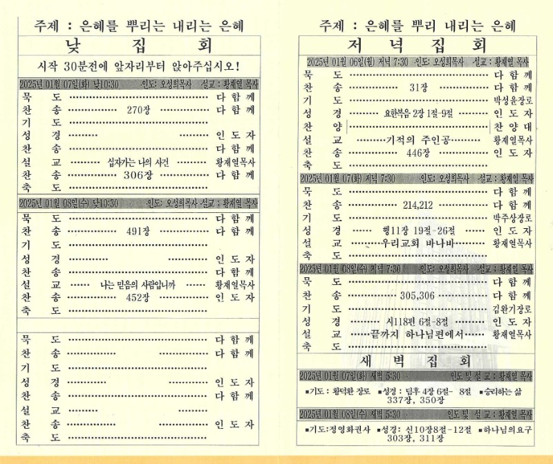 이번 부흥성회는 현재 부산 세광교회를 시무하고있는 황재열 목사를 초청, 이날 저녁예배(7시30분)를 시작으로 오는 8일(수) 저녁 예배(7시30분)까지 사흘간 열린다.