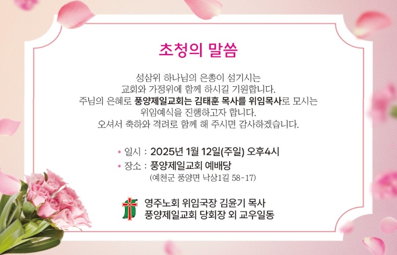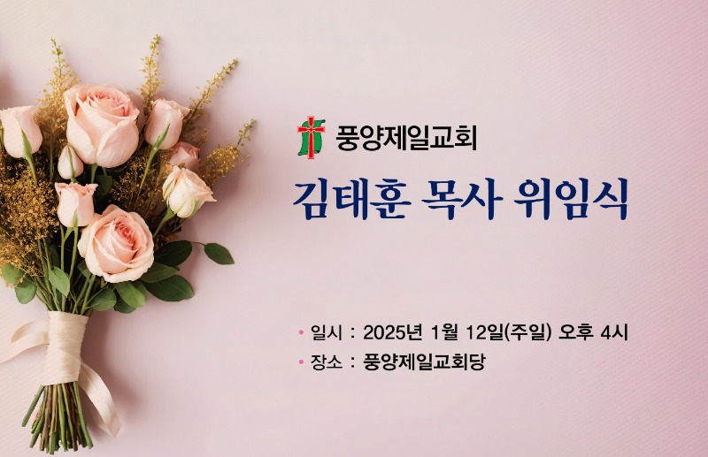 [채석일 기자]풍양제일교회(김태훈 목사)는 12일 오후4시 교회 예배당에서 김태훈 담임목사 위임식을 거행한다.