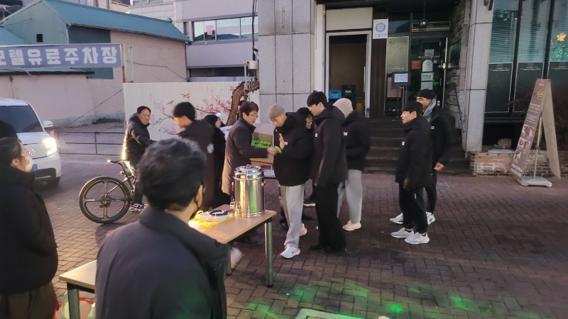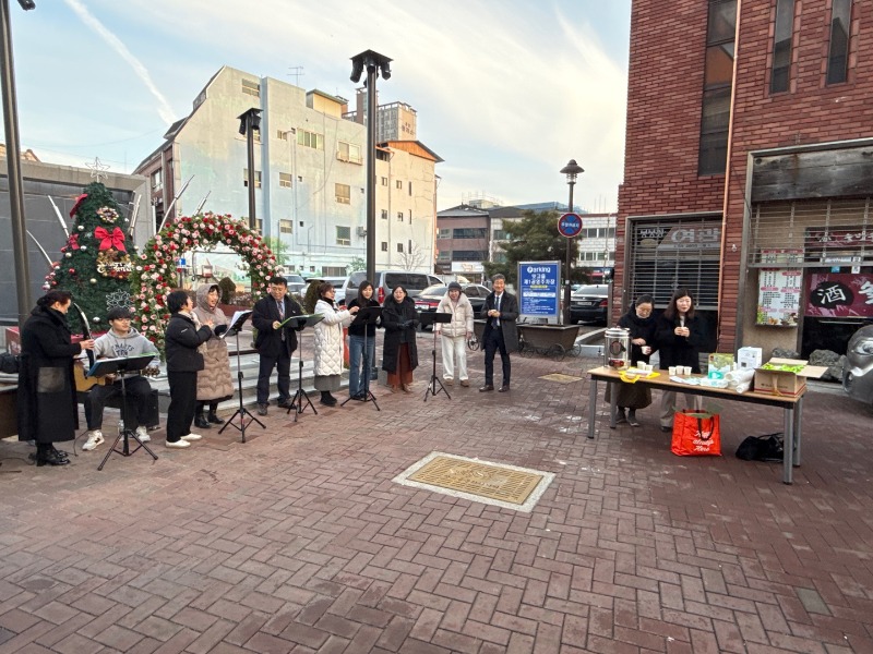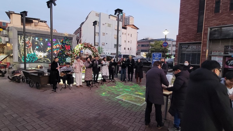 19일(일) 오후,한파의 날씨속에서 예천제일교회(김운수 목사) 10여명 성도들은 맛고을 거리 무대에서 버스킹 찬양을 하며 지나가는 주민들에게 예수 복음을 전하며 따뜻한 차와 간식을 전했다.