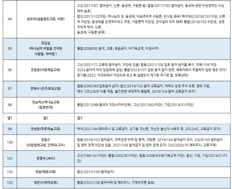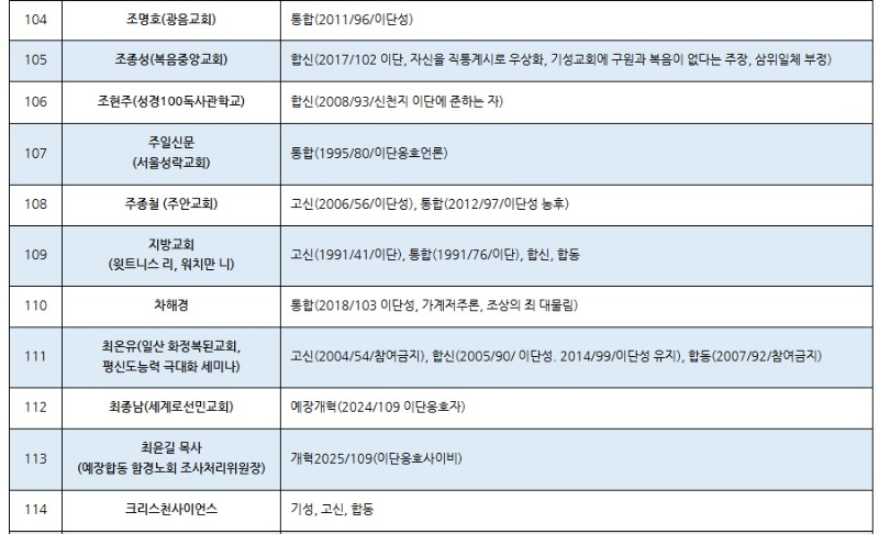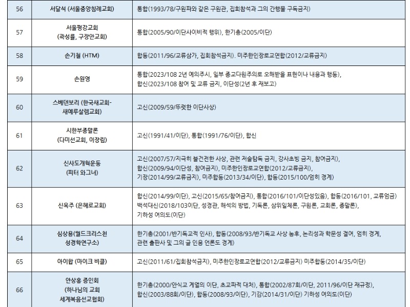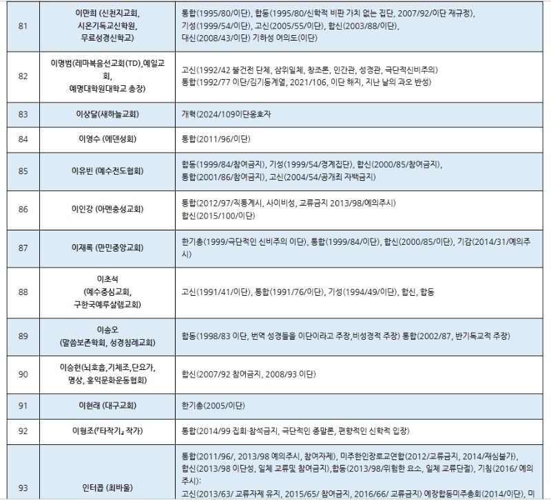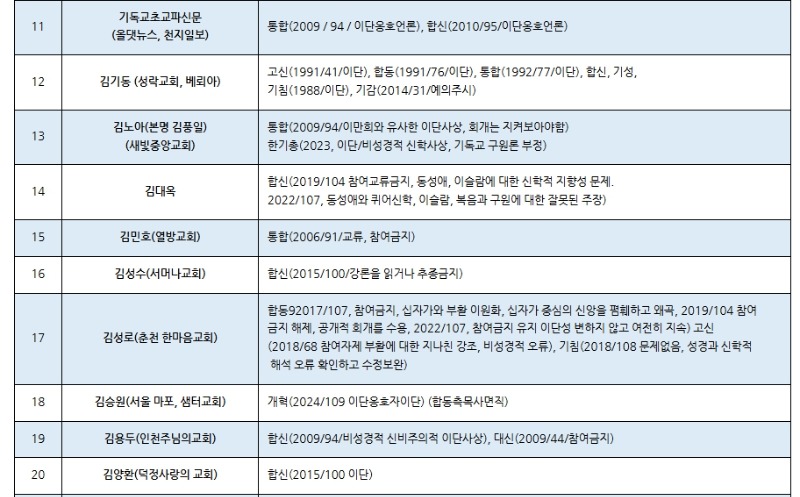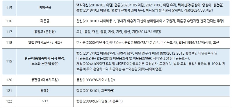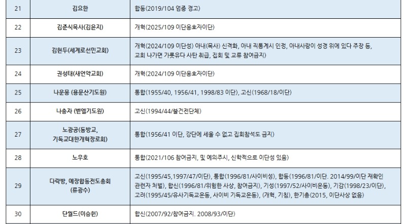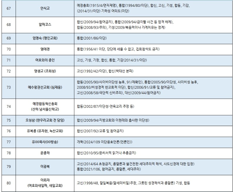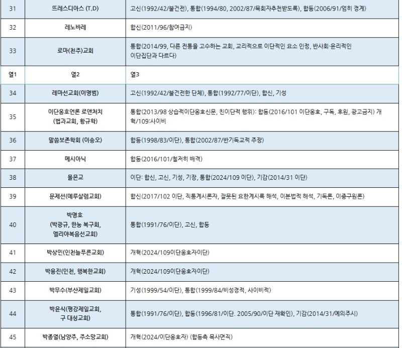 한국교회 주요 공교단 규정 이단(이단성) 명단(2025.02월 현재) (가나다 순) 저작권: 이단타파