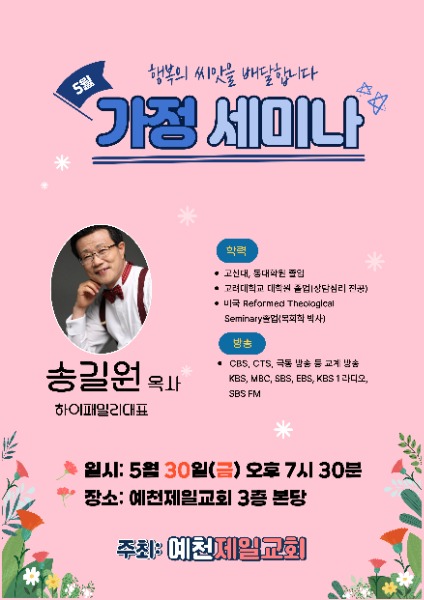 한편 이번 가정세미나 초청 강사 송길원 목사(하이패밀리 대표)는 고신대,동대학원 과 고려대학교 대학원(상담심리 전공)을 졸업, 미국 Reformed Theological Seminary를 졸업한 목회학 박사이며 현재 CBS , CTS , 극동방송을 비롯한 교계방송과 KBS,MBC,SBS,EBS등에서 방송 활동 중이다.