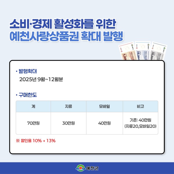구매 한도와 혜택도 강화된다. 개인별 구매 상한을 기존 월 40만 원(지류 20만 원, 모바일 20만 원)에서 월 70만 원(지류 30만 원, 모바일 40만 원)으로 확대하고, 할인율도 10%에서 13%로 높여 군민들이 더 많은 혜택을 체감할 수 있도록 했다.