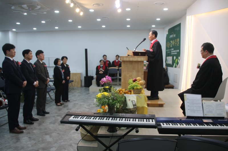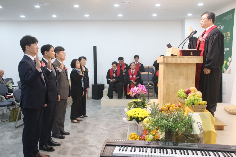 이 자리에서 김성은 안수집사를 비롯해 문진호, 이승희 안수집사 임직과 장춘화, 홍귀숙 권사가 새롭게 일꾼으로 부름 받았다.