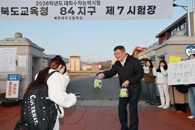 김학동 예천군수는 시험장인 경북일고등학교와 예천여자고등학교를 찾아 수험생들을 격려하며 “오늘은 그동안 흘린 땀과 노력이 결실을 맺는 날입니다”며, “여러분이 지금까지 준비해 온 과정 자체가 이미 큰 자산이며, 오늘의 시험이 끝이 아니라 새로운 출발이 되길 바란다”고 따뜻한 응원의 말을 전했다.