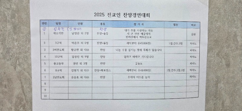 경연대회는 제2남전도회팀(유승호외 다수)이 '우리의 어두운 눈이' 를 찬양하여 1등의 영광을 차지했으며, 2등에는 3구역팀이 3등에는 제3여전도회팀이 수상했고 청년부 임수진 청년은 '그피가'를 은혜롭게 찬양해 '은혜상'을 수상하는 영예를 안았다.