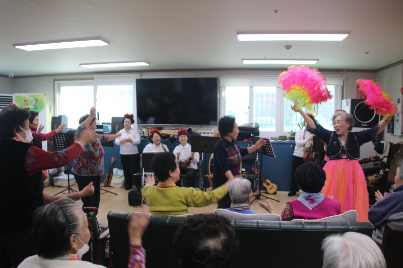 우쿨마을 동아리 김애자 회장의 사회로 시작된 공연은 동아리 홍의숙 회원의 숄더건반 연주 ‘어머님 은혜’를 지작으로 우쿨렐레와 하모니카 연주, 부채춤등으로 어르신들의 마음을 사로잡았고, 부채춤 공연은 어르신들의 눈과 귀를 즐겁게 하며 어르신들은 자리에서 일어나 덩실덩실 함께 춤을추며, 신명나는 시간을 보냈다.