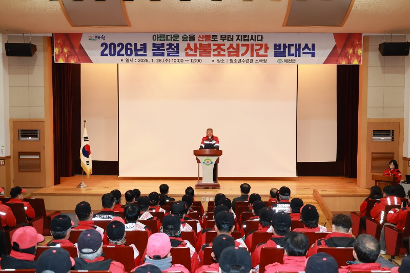 예천군(군수 김학동)은『2026년 봄철 산불조심기간』(1. 20. ~ 5. 15.)을 맞아 28일 오전 10시 예천청소년수련관에서 산불감시원, 산림재난대응단(산불전문예방진화대) 등 130여 명이 참석한 가운데 산불예방 결의를 다지는 발대식 및 캠페인을 가졌다.