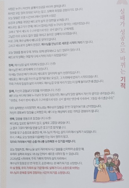 본문은 누가복음 5장1-11절이며, 설교 제목은 ‘실패가 성공으로 바뀌는 기적’이다. 설교문은 성경말씀을 중심으로, “예수님을 삶의 자리에 모시고 말씀을 신뢰하며 순종할 때,우리의 실패와 좌절도 하나님안에서 새로운 시작이 될 수 있다.2026년을 시작하며 우리 가족이 각자의 삶의 자리에서 예수님 말씀을 한번 더 믿고 순종해보는 한 해가 되기를 소망한다”.가정 안에서 자존심이나 감정이 아니라 ‘그리스도의 평강’이 판단 기준이 되어야 함을 강조한다.