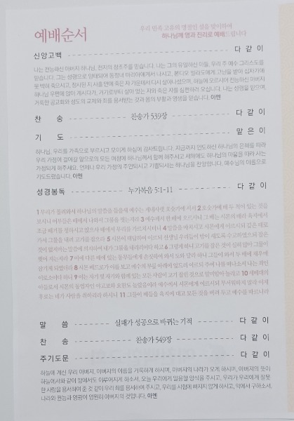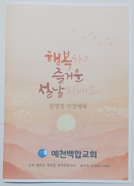 예천백합교회(김경환 목사)는 2026년 설 명절을 맞아 ‘설 가정예배 순서’를 교인들에게 배포했다. 순서지에 따르면 예배는 신앙고백, 찬송(‘너 예수께 조용히 나가’), 대표기도, 성경봉독, 설교, 찬송(‘내 주여 뜻대로’), 주기도문 순으로 진행된다.