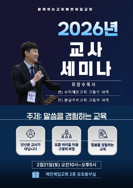 [채석일 기자]예천제일교회(김운수 목사)는21일(토) 오전 10시부터 교회 2층 유.초등부 교육관에서 교회학교 교사와 성도등 50여명이 참석한 가운데 수지예본교회 최창수 목사를 초청해 '2026년도 교사교육세미나'를 개최했다.