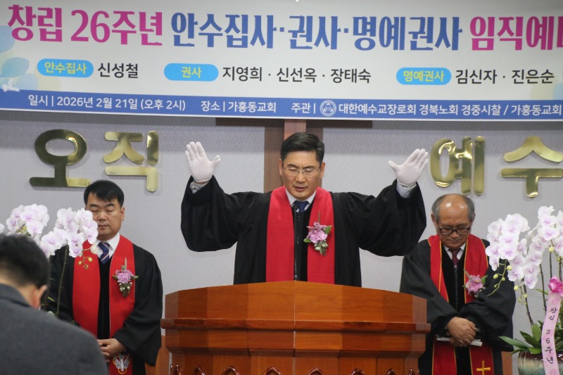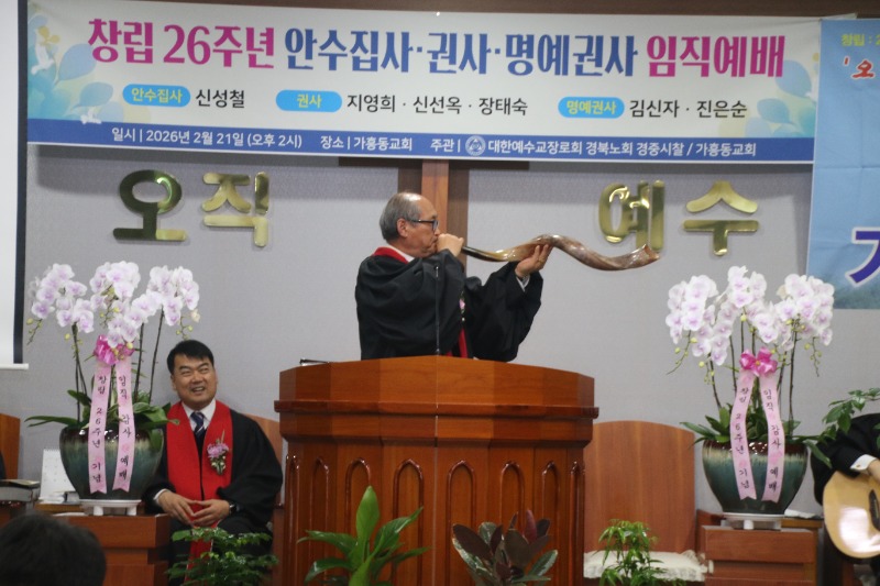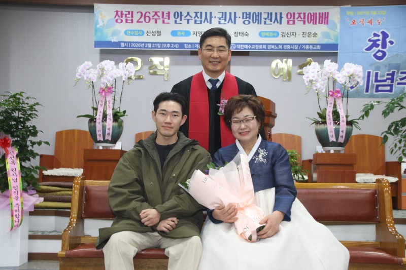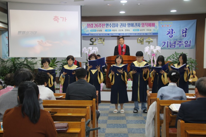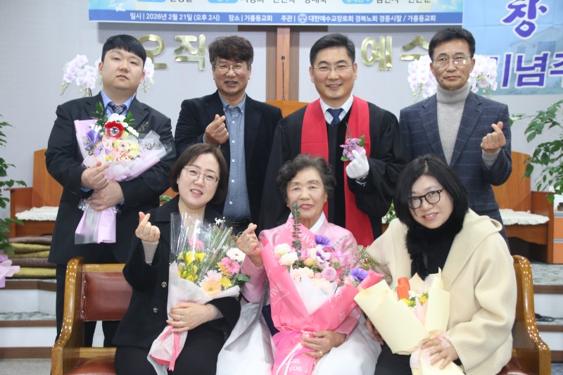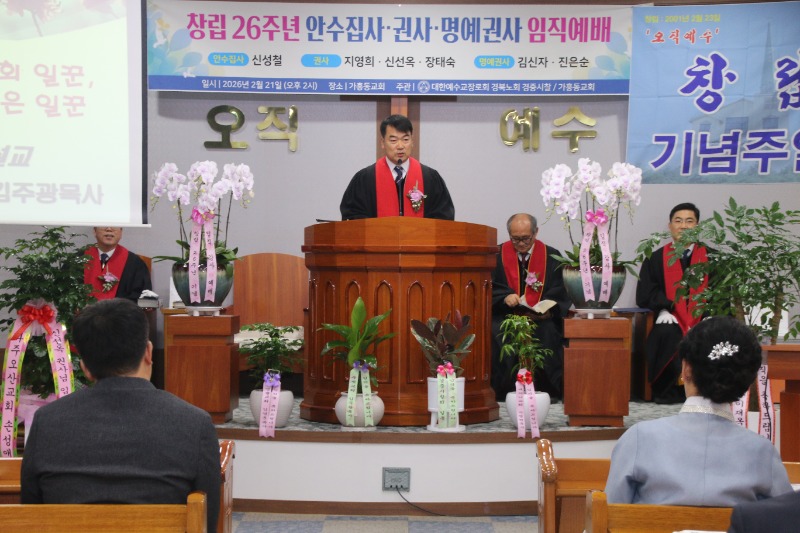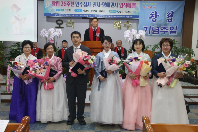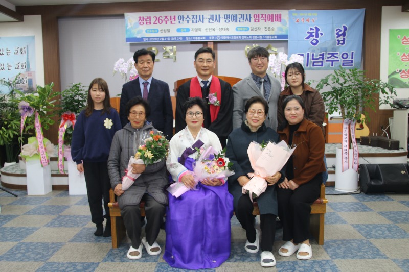 [채석일 기자]대한예수교장로회 가흥동교회(김삼일 목사.영주)가 창립 26주년을 기념하며 21일 교회 본당에서 안수집사 및 권사,명예권사 임직 감사예배를 드렸다.