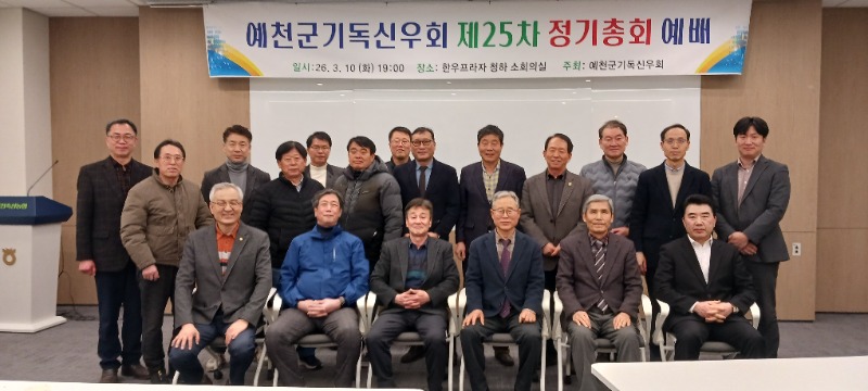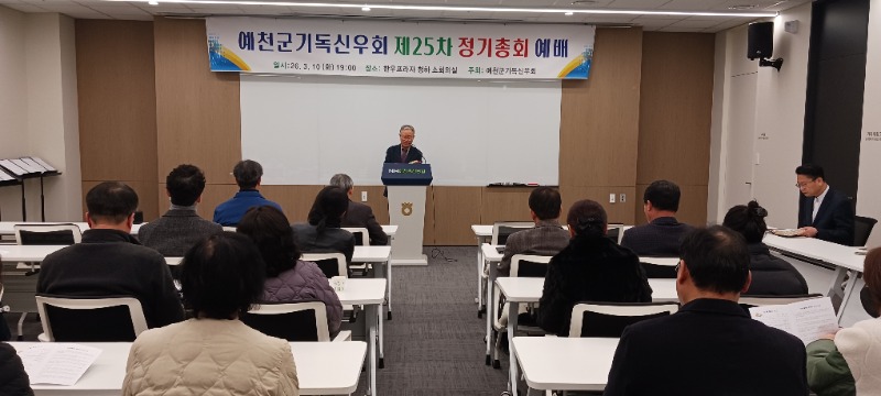 1부 예배에 이어 2부 총회에서는 황칠환 회장(예천교회 장로)의 사회로 최국낙 장로(예천교회)의 기도,서기 박성윤 장로(금곡교회)의 회원점명에 이은 감사보고 및 사업,회계보고와함께 2026년도 신 임원을 선출 했으며 신 안건 토의 시간과 신임회장(채석일 장로.예천백합교회)의 기도 및 폐회 후 소통의 시간을 나눴다.