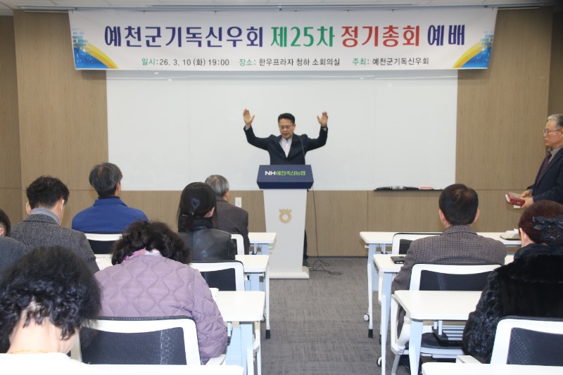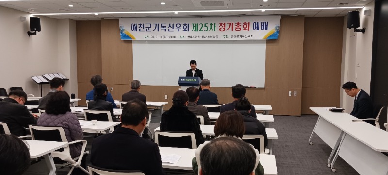 [채석일 기자]예천군기독신우회(회장 황칠환 장로.예천교회)가 10일 저녁7시 예천축협프라자 회의실에서 신우회 황칠환 회장을 비롯한 40여명이 회원이 참석한 가운데 제25차 정기총회 예배를 가졌다.