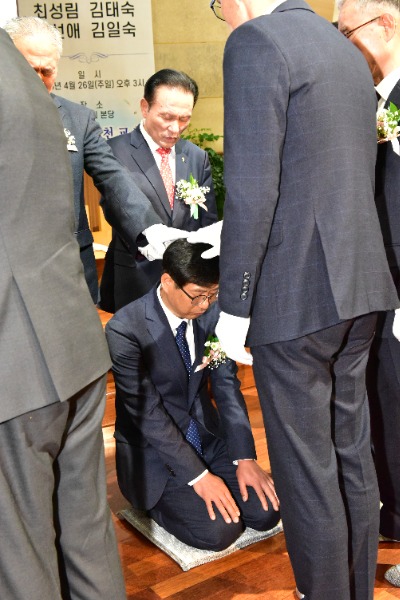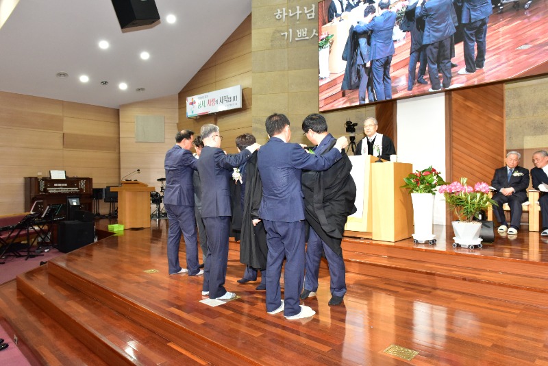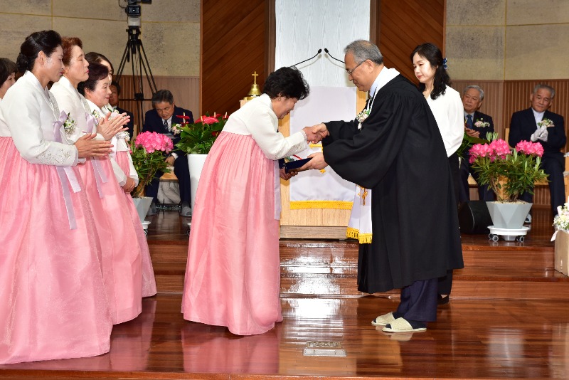 임직식에서는 교회 선배장로가 장로임직자들에게 성의를 착의하고 장로회와 남.여전도회에서 장로회원패와 기념품을 전달했다.