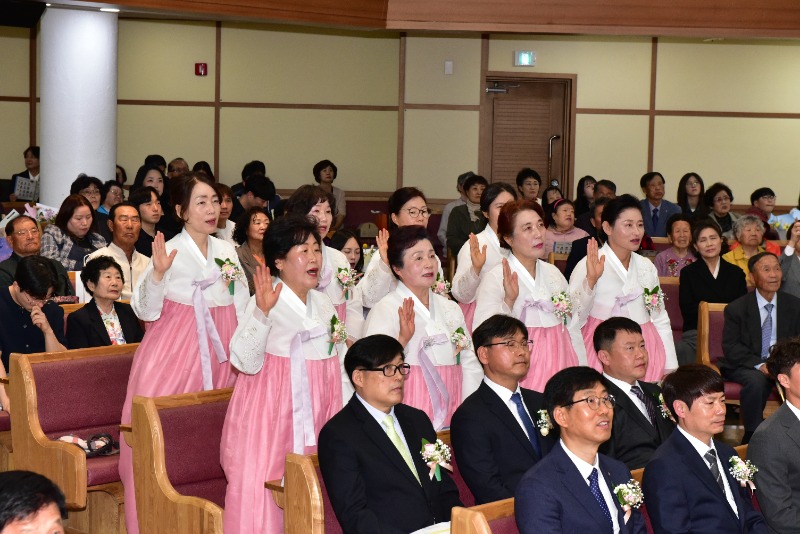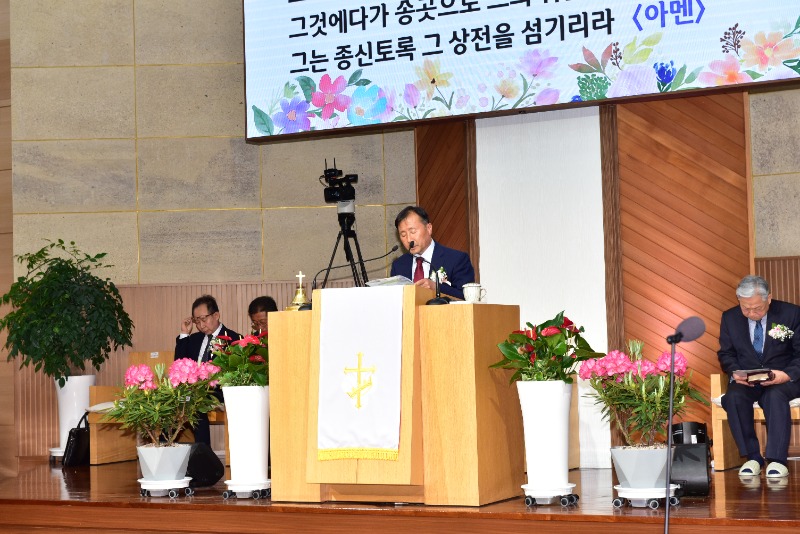 전노회장 김윤기 목사(어신교회)의 권면과 영주노회장 황강섭 장로(성남교회)의 축사가 이어졌으며, 예천교회 여울오카리나앙상블 특별찬양은 예배의 감동을 더했다.