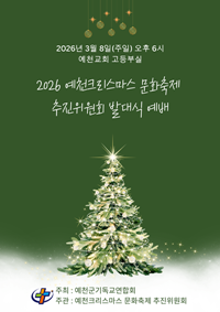 [채석일 기자]예천군기독교연합회(회장 도재근 목사.호명교회)가 올해 크리스마스를 준비하며 예천기독문화의 새로운 바람을 일으킬 준비를 하고 있다고 밝혔다.'예천크리스마스문화축제'라 명명한 기독문화 축제는 올해 12월 20일(일) 오후에 개막을 시작으로 26일까...