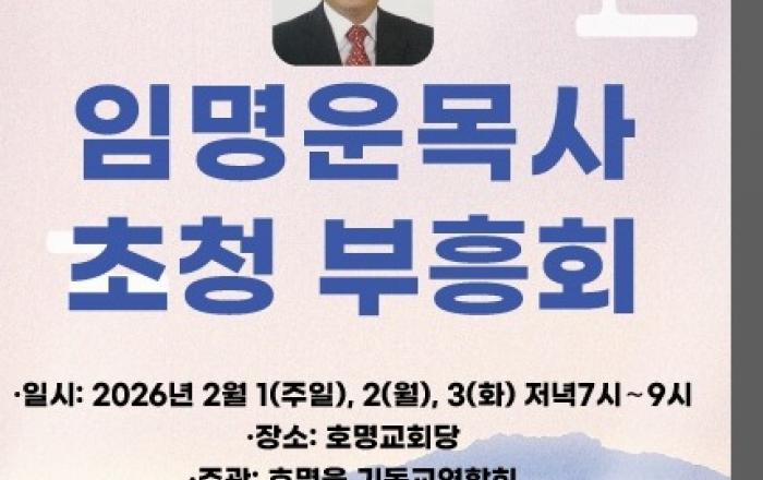[채석일 기자]예천군 호명읍기독교연합회(회장 도재근 목사.호명교회)가 오는 2월 1일부터 3일까지 사흘간 호명교회(도재근 목사) 예배당에서 포항 항도교회 담임목사인 임명운 목사를 초청 신년부흥회를 개최한다고 밝혔다.이번 부흥성회 강사인 임명운 목사(포항 항도교회)는 2